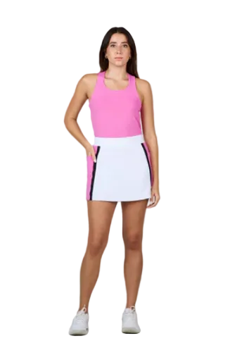 This 15" women’s tennis skirt offers extended coverage with a flattering, streamlined silhouette. Designed with sporty side inserts for enhanced movement and visual interest, it also features functional pockets for on-court convenience. Crafted for performance and comfort, this skirt delivers a polished look with practical details, making it ideal for both match play and training.